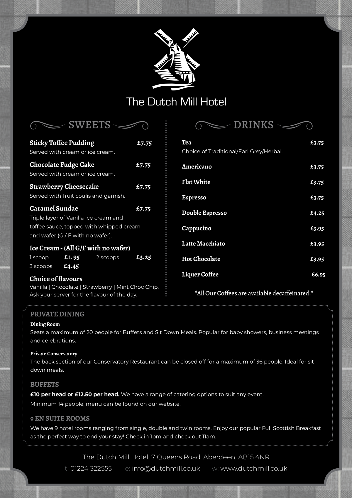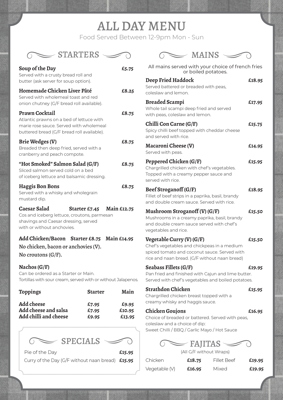 Our All-Day Menu is served between 12pm – 9pm Monday – Sunday. Please note that this menu is the only menu option we are serving from at the moment along with our full drinks menu.